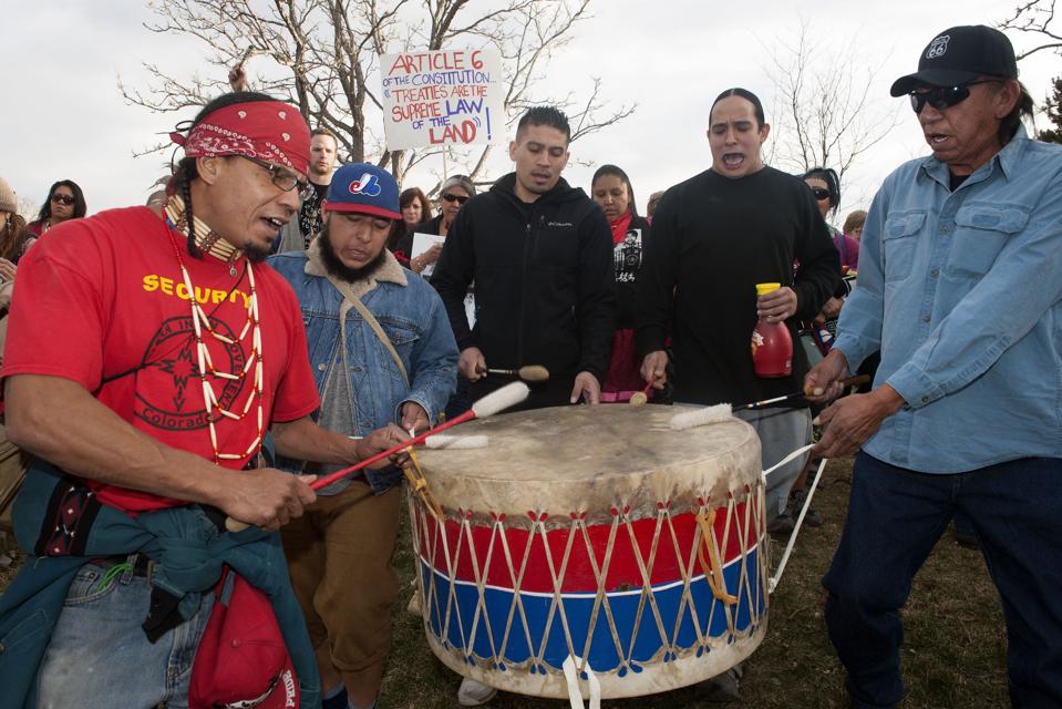 Native American drummers lead the Native Nations March in Denver, Colorado on March 10, 2017.Native tribes from around the US gathered for four days of protest against the administration of US President Donald Trump and the Dakota Access oil pipeline. In the first week of his presidency, Donald Trump signed executive orders to revive the Dakota Access project, along with a second pipeline put on hold by the Obama administration, Keystone XL. / AFP PHOTO / Jason Connolly (Photo credit should read JASON CONNOLLY/AFP/Getty Images)