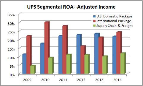 UPS productivityTo see the impact of the three big trends, I've broken out segmental ROA for UPS. For reference, the U.S. domestic package segment contributed 63% of adjusted segmental income in 2014, with international package 27% and supply chain and freight around 10%. Note that these figures are not adjusted for non-recurring items.