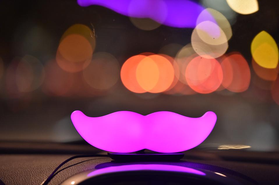 A Lyft Glowstache sits on the dashboard of a car in San Francisco on Feb. 03, 2016. (Photo Credit: Josh Edelson/AP Images for Lyft)